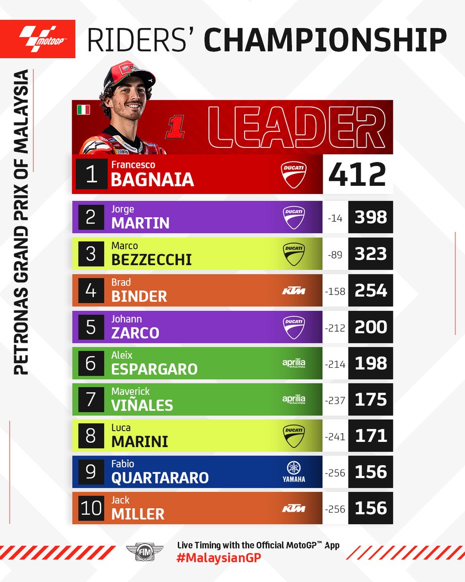 Kausi on ollut Ducatin hallintaa. Kesällä näytti, että hallitseva mestari Francesco Bagnaia aja ylivoimaiseen mestaruuteen, mutta Barcelonan kilpailussa hän kaatui pahasti ja KTM:n Brad Binder ei ehtinyt väistää, vaan ajoi italialaisen jalan yli. Onneksi tilanteesta selvittiin sairaalatarkastuksella. Seuraavissa kisoissa Peccon vauhti oli kadoksissa, joten yksityistallilla ajava Espanjan Jorge Martin kuroi piste-eroa umpeen. Kun kaksi on jäljellä, niin ero kaksikon välillä on 14 pistettä ja jaossa on vielä 74 pistettä.